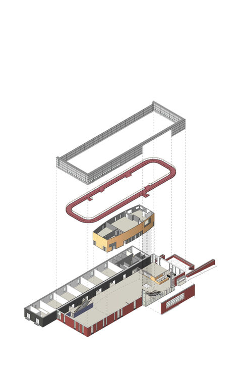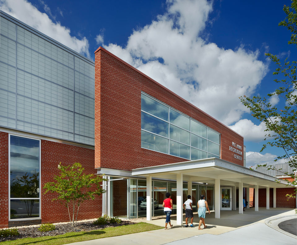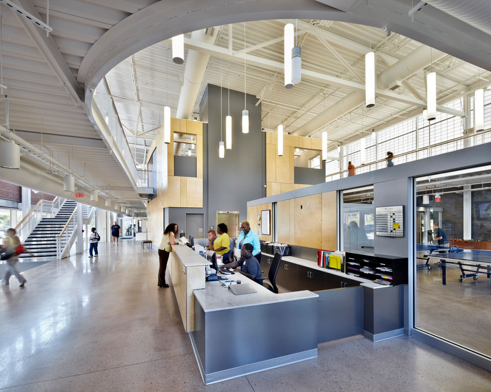 Community centers are important “Third Places” that serve cross-sections of local populations. For the Town of Holly Springs, it was important to create a fun and active environment that is attractive and inviting to their residents. At the same time, the project had to be economically designed to be feasible. To meet these needs, the design approach was to simply organize uses within and around a large, translucent “container.” Attached to the outside of the container is the gymnasium at the front and a strip of classrooms at the back. Within the container is a large open space, an elevated running track and a central, curved volume or “vessel.” The “vessel" acts as a central organizing element that hides the locker rooms, utilities and aerobics rooms. Concentrating these elements within this curved central mass preserves the openness of the day-lit interior, freeing it from clutter. Meanwhile, the elevated running track loops around the volume, creating an enjoyable pathway that overlook a variety of activities below along with views to the outdoors. Together these elements create a dynamic environment that openly displays its activities while also organizing them into discrete zones. The project is today a much loved gathering spot for the Holly Springs community.